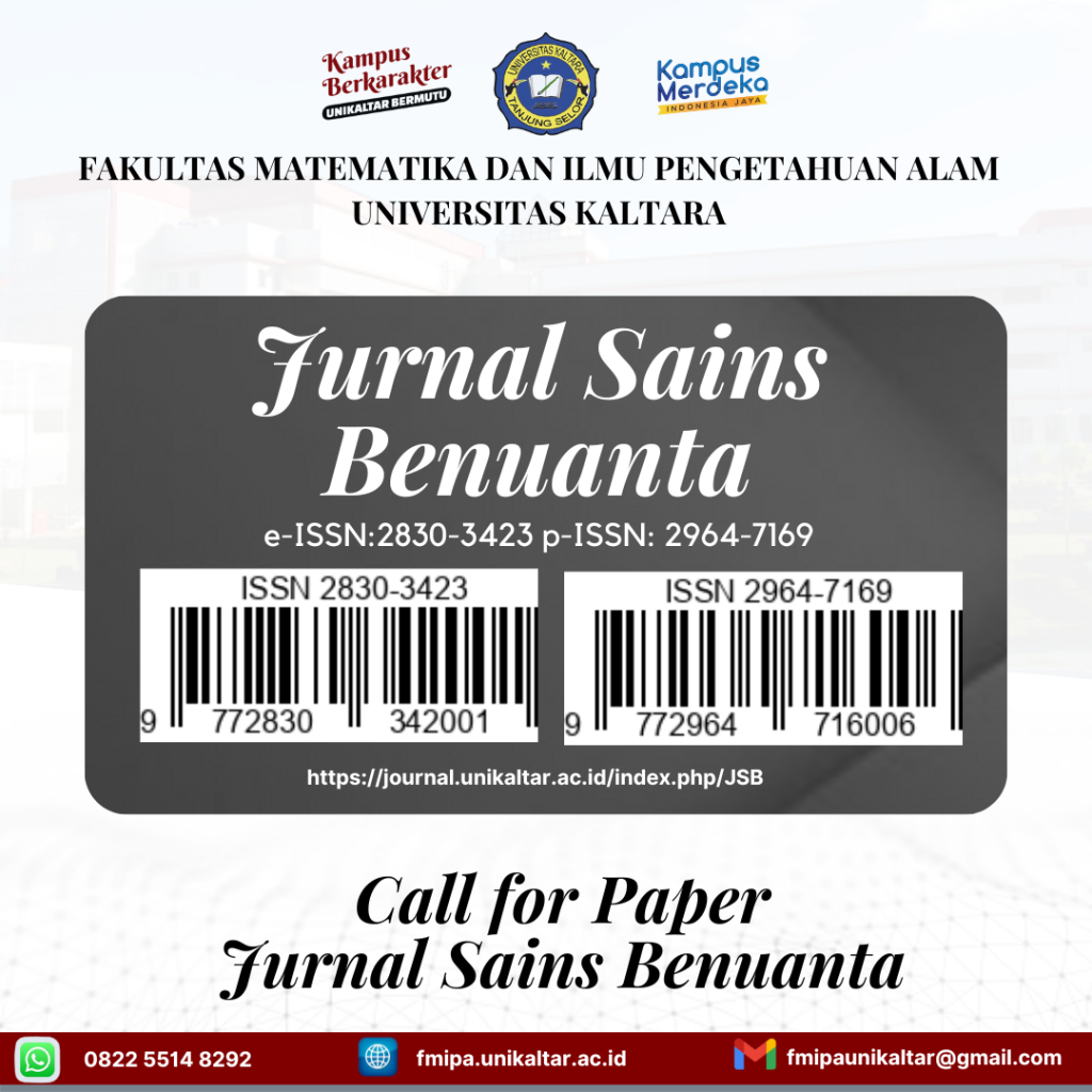 Jurnal Sains Benuanta merupakan jurnal ilmiah yang diterbitkan oleh Fakultas Matematika dan Ilmu Pengetahuan Alam (FMIPA) Universitas Kaltara. Jurnal ini terbit dua kali dalam setahun yaitu pada bulan Juni dan Desember. Terbitan pertama jurnal ini dapat dilihat di website JSB Vol 1 No 1 Juni 2022. Jurnal ini merupakan salah satu wadah mempublikasikan tulisan hasil