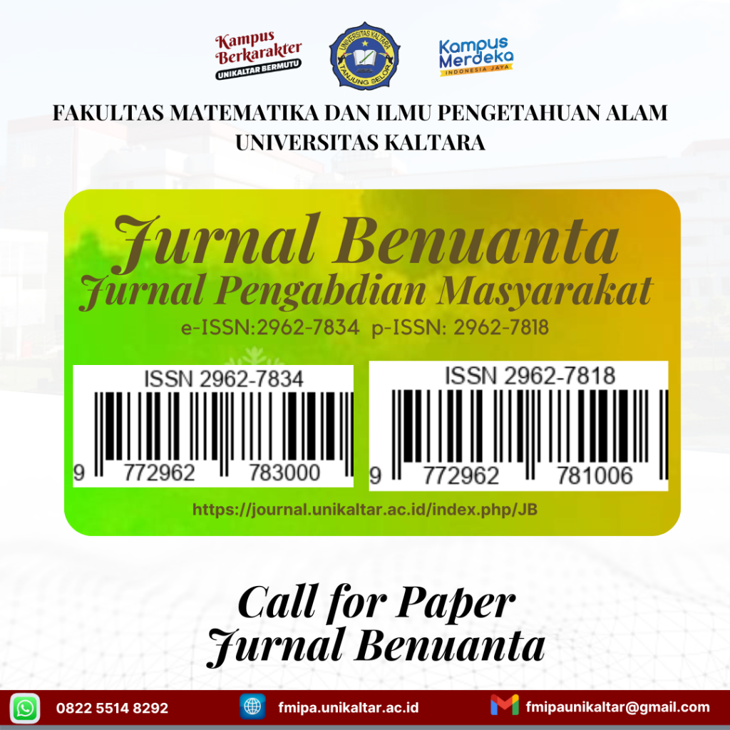 Jurnal Benuanta (JB) merupakan Jurnal Pengabdian Masyarakat yang diterbitkan oleh Fakultas Matematika dan Ilmu Pengetahuan Alam Universitas Kaltara. sama seperti jurnal pengabdian yang lainnya jurnal ini membahas praktik dan proses pengabdian di masyarakat. Jurnal ini menyediakan forum bagi akademisi dan praktisi untuk mengeksplorasi masalah dan merefleksikan praktik yang berkaitan dengan layanan pengabdian masyarakat. Jurnal ini adalah jurnal daring yang didedikasikan untuk