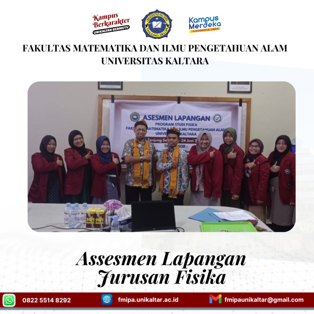Program studi Fisika Fakultas MIPA Unikaltar Jenjang Sarjana pada tanggal 22-23 Juni 2023 menerima kunjungan Asesor dari Lembaga Akreditasi Mandiri Sains Alam dan Ilmu Formal (LAMSAMA) yaitu Drs. Johan Andoyo Effendi Noor, M.Sc., Pd.D. dan Dr. Masturi, M.Si. Kegiatan Asesmen Lapangan diawali dengan acara Seremonial pembukaan asesmen oleh Dekan FMIPA Ratna Dwi Christyanti, M.Si dan
