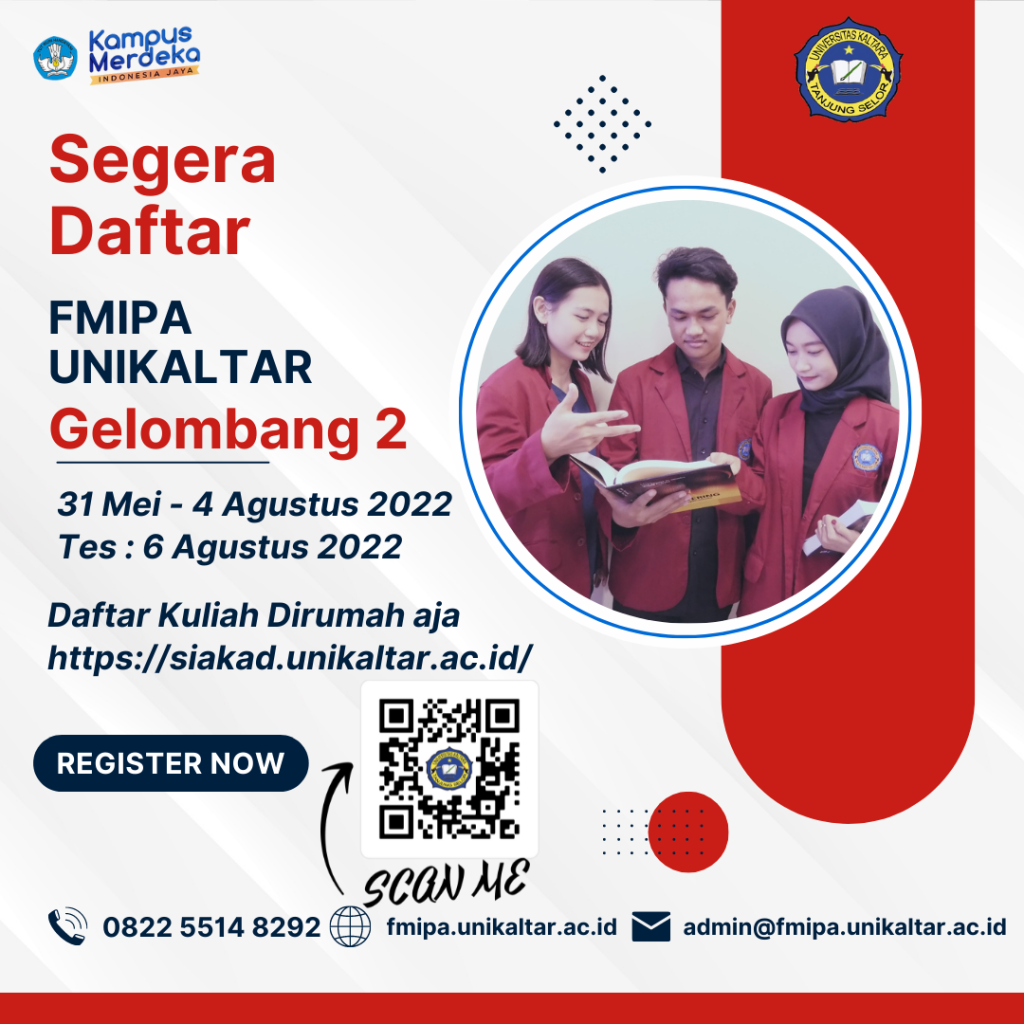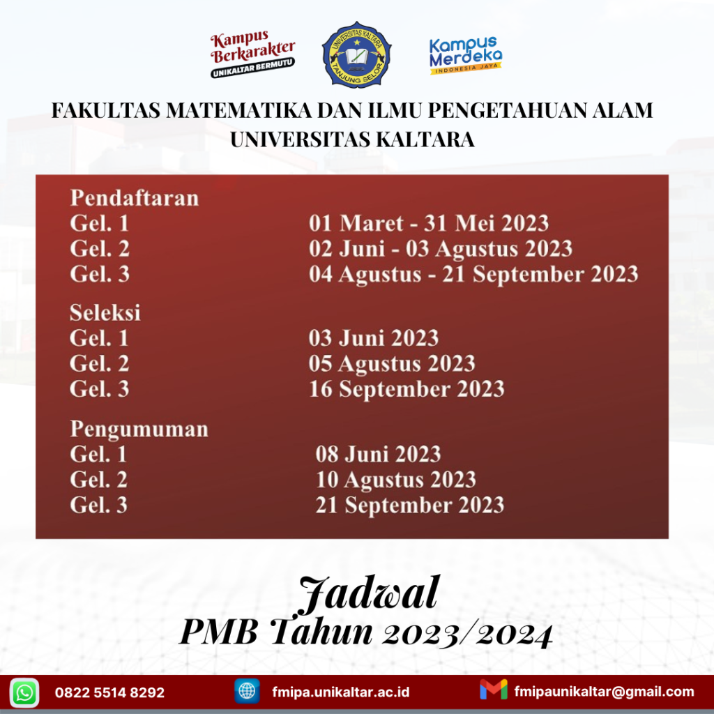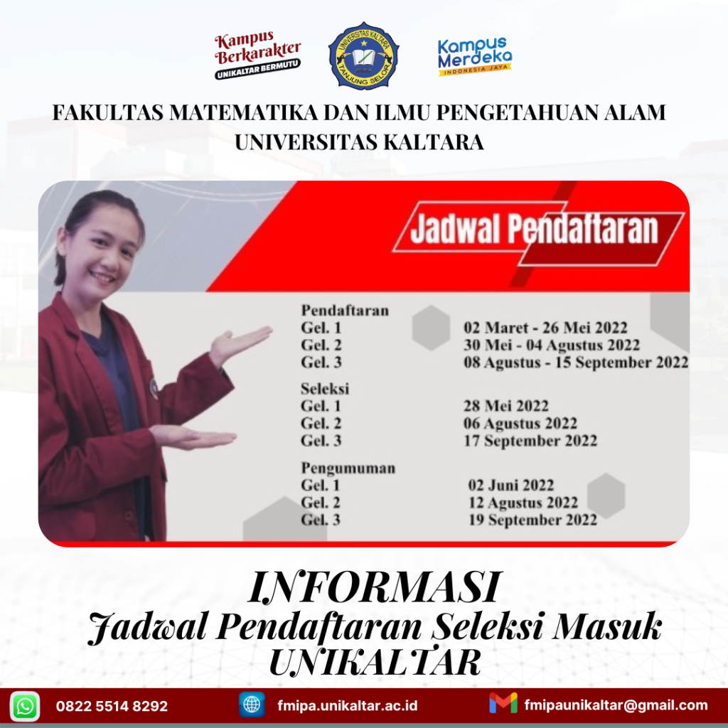Pendaftaran mahasiswa baru Fakultas MIPA Universsitas Kaltara tahun ajaran 2023/2024 akan segera dibuka. pendaftaran dibagi menjadi tiga gelombang dengan jadwal sebagai berikut Gelombang 1Pendaftaran : 01 Maret – 31 Mei 2023Seleksi : 03 Juni 2023Pengumuman : 08 Juni 2023 Gelombang 2Pendaftaran : 02 Juni – 03 Agustus 2023Seleksi : 05 Agustus 2023Pengumuman : 10 Agustus […]
